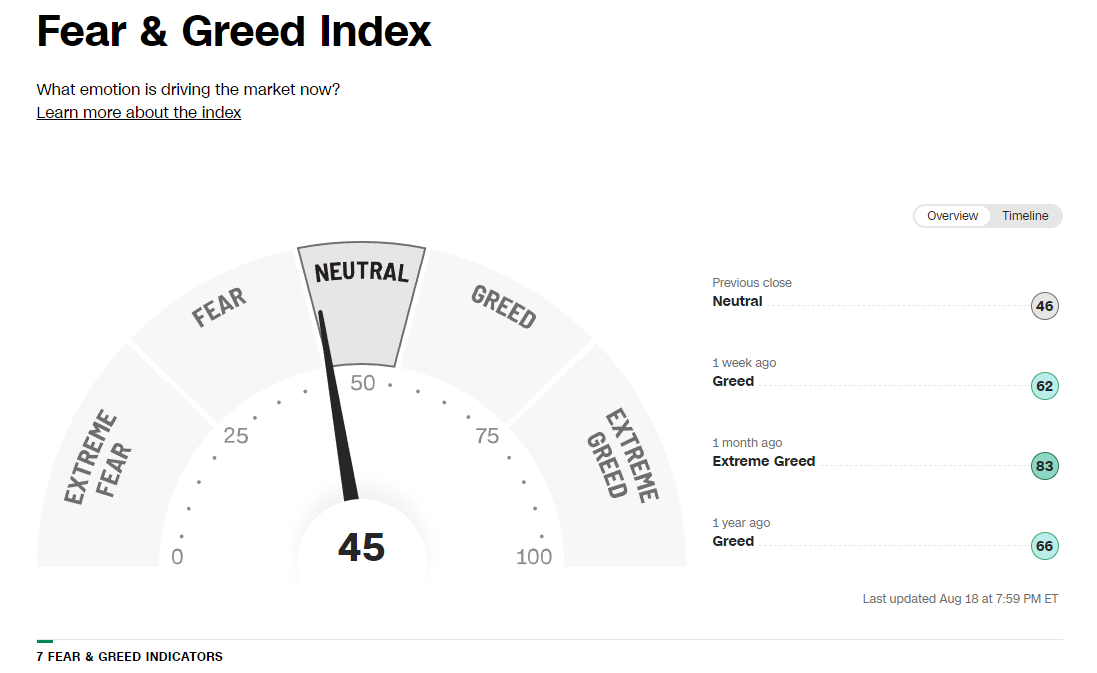 공포 탐욕 지수(Fear & Greed Index)가 fear와 neutral의 교차점인 45에 도달했다.
